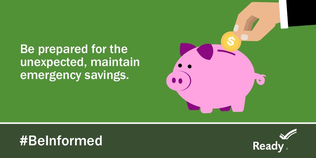 Graphic image of a piggy bank and blank sheets of paper representing important household docments on a tan background with dark blue wording and a Ready logo. Financial preparedness. For more tips visit www.ready.gov.