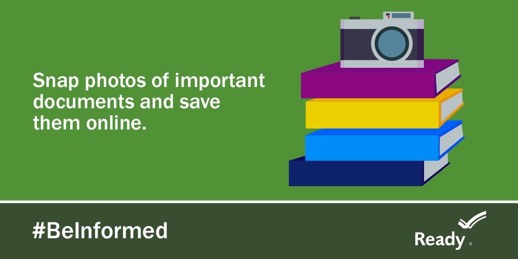 Graphic image of four brightly covered books with a camera sitting on top of the stack, against a green background. Snap photos of important documents and save them online. #BeInformed